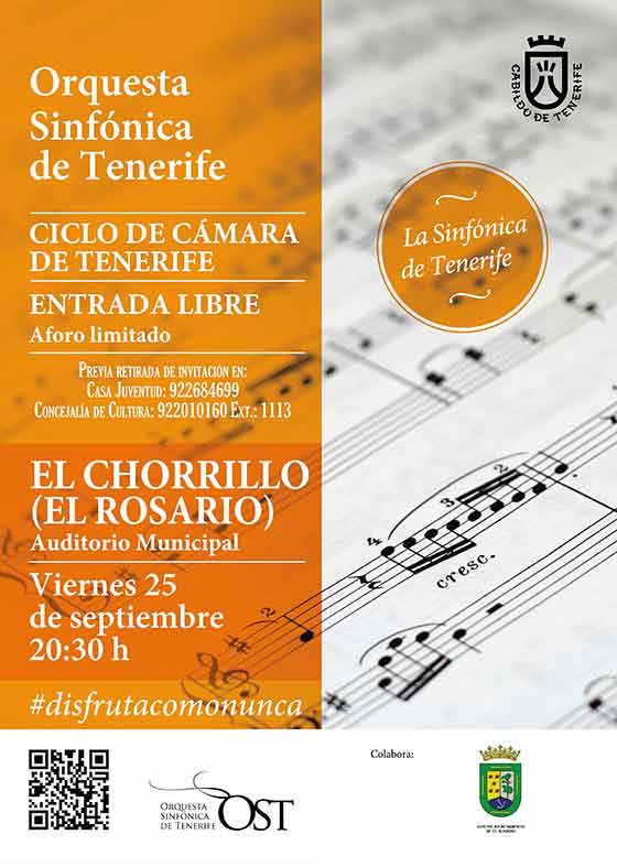 El municipio de El Rosario acoge este viernes, 25 de septiembre, el concierto de la nueva edición deI Ciclo de Cámara de Tenerife que lleva a cabo un grupo de músicos integrantes de la Orquesta Sinfónica de Tenerife (OST). Se desarrollará en el Auditorio de la Casa de la Juventud de El Chorrillo a partir de las 20:30 horas. Este ciclo, patrocinado por el Cabildo Insular de Tenerife, acerca repertorios sinfónicos a personas de los distintos municipios de la Isla que normalmente tendrían mayores dificultades para escuchar a la OST.