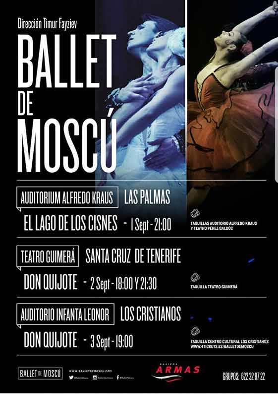 El Ballet de Moscú vuelve a Canarias en su gira de verano que incluye citas en una veintena de ciudades de toda España. El público tendrá podrá presenciar dos obras cumbre de la danza clásica: ‘El Lago de los Cisnes’, creado por dos leyendas del ballet como fueron Marius Petipá y Lev Ivanov, y con la música insuperable de Tchaikovsky. ‘Don Quijote’, una de las obras más emblemáticas de la historia de la danza teatral, también del gran Petipá con música de Ludwig Minkus, basada en la gran novela de Cervantes y llena de virtuosismo y energía.