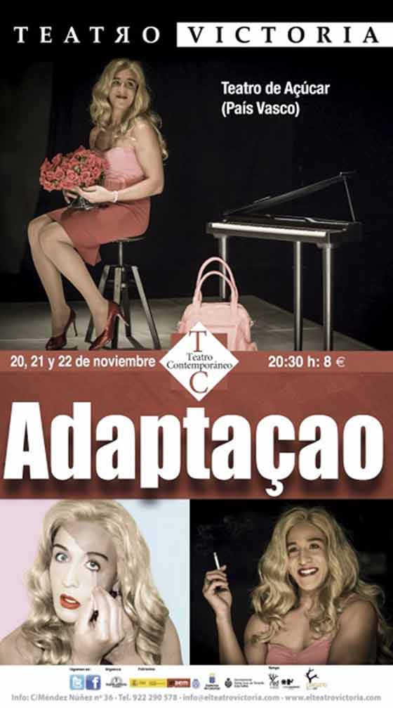 Del 20 al 22 de noviembre el Teatro Victoria acogerá a la compañía Teatro de Açúcar (País Vasco) con Adaptaçao, un espectáculo, con formato de monólogo y texto, dirección e interpretación de Gabriel F, que cuenta la historia de unos personajes en un momento de adaptación como medio de supervivencia: un director teatral frustrado, que no consigue salir de una crisis creativa y decide cambiar de profesión; una actriz recién llegada a la gran ciudad; una transexual, que adaptó su cuerpo para poder seguir viviendo en él; un dinosaurio que no sabe si sobrevivirá a las adaptaciones de su especie. Todos, unidos por un drama común: el miedo a morir, a transformarse, a dejar de existir... La obra, estrenada en 2014, cuenta con el bailarín y coreógrafo Igor Calonge como ayudante de dirección.