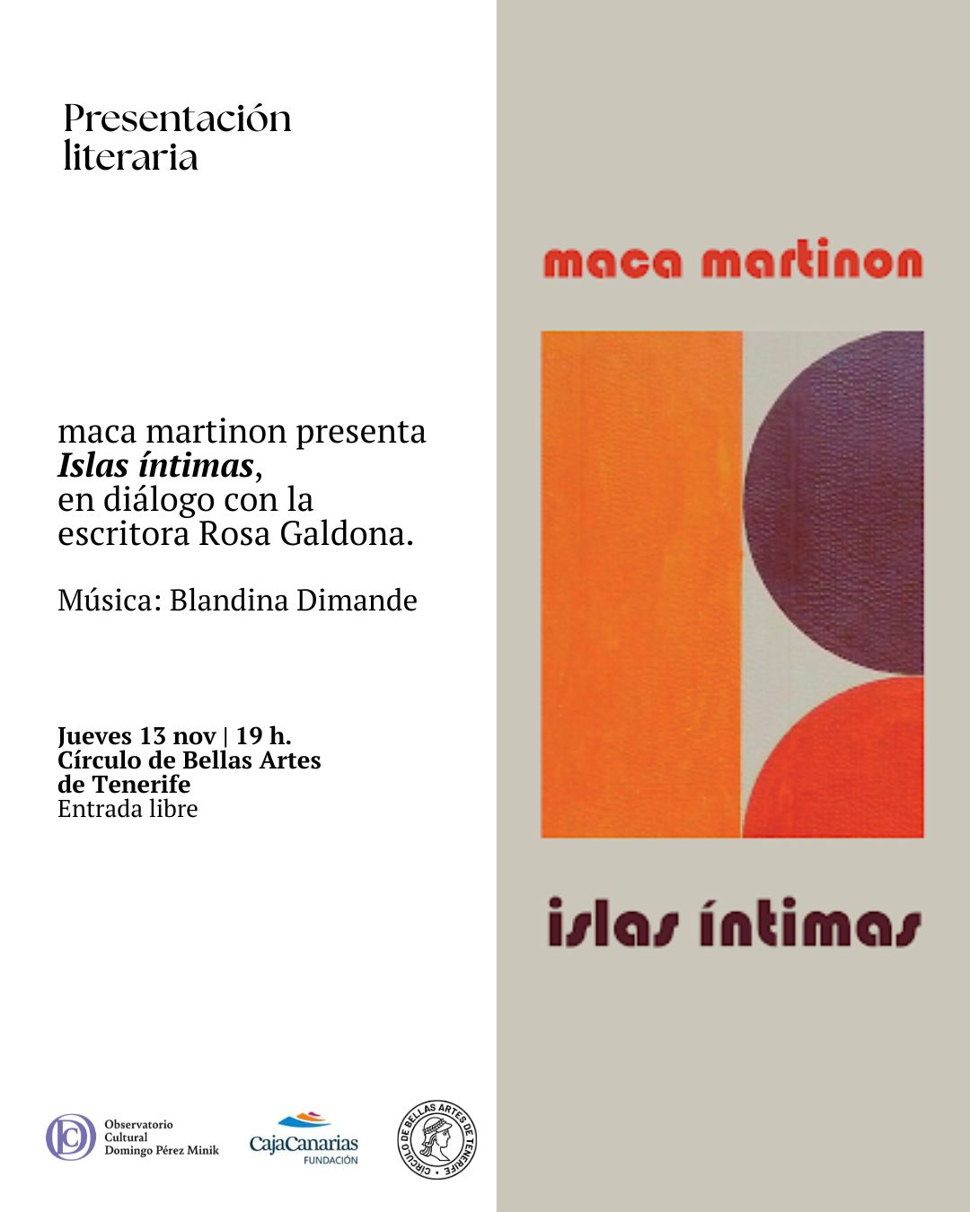 El Círculo de Bellas Artes de Tenerife acoge un encuentro literario en torno a Islas íntimas, de la escritora tinerfeña maca martinon. Un conjunto de doce relatos en los que se desvela, además de la vida visible y pública de los personajes, también la oculta y secreta. La autora presenta este libro en diálogo con la también escritora Rosa Galdona, en una velada que tendrá lugar este jueves 13 de noviembre, a las 19:00 horas, con entrada libre, organizada por el Observatorio Cultural Domingo Pérez Minik. La nota musical la pondrá la multiinstrumentista Blandina Dimande.