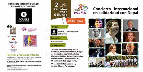 El día 2 de octubre de 2015, a las 22:00 horas, en el Espacio Cultural Aguere, (La Laguna), tendrá lugar un Concierto Internacional en solidaridad con Nepal. El citado concierto estará representado por importantes solistas y grupos musicales tinerfeños, con la participación de Chago Melían; Héctor González; Fabiola Socas, Melquiades Cruz, Luisa Machado, Candelaria y Elena González; Mencey romántico y Grupo Musical Popular Tintillo.