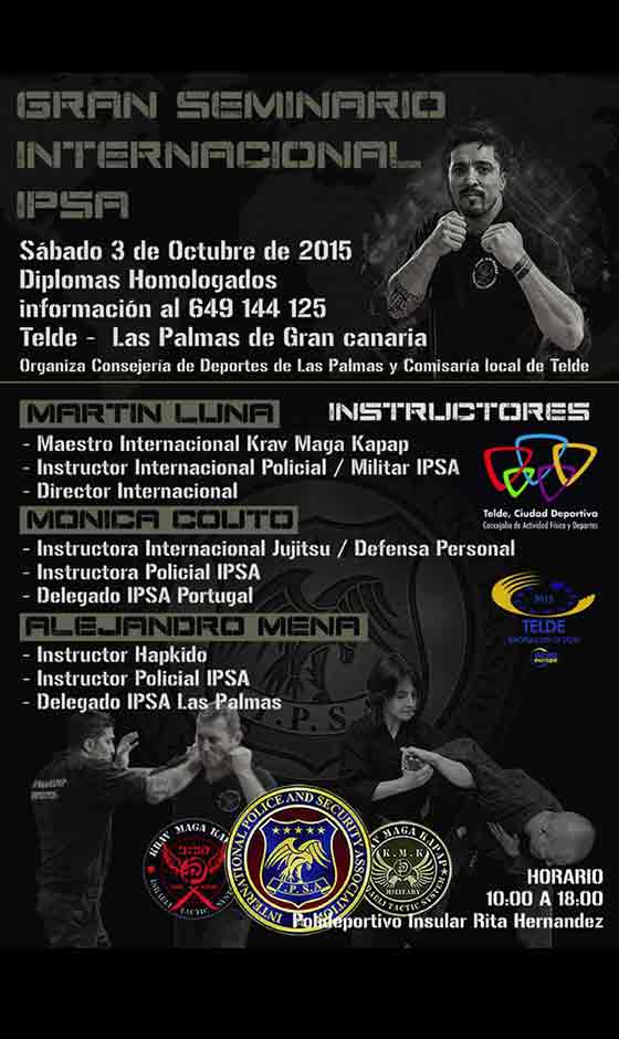 La Concejalía de Actividad Física y Deportes, que dirige Diego Ojeda, colabora muy estrechamente en la celebración de la tercera edición del “Gran Seminario Internacional IPSA (Intervención Policial Seguridad y Escolta), que se desarrollará, el próximo sábado día 3, en el Pabellón Insular Rita Hernández desde las 10.00 horas hasta las 18.00 horas, de forma intensiva y con la docencia a cargo de maestros de reconocido prestigio como Luna Martin, actualmente 7 Dan Krav Maga y 6 Kempo Karate, Instructor Policial/Instructor Internacional/ Militar IPSA, también se contará con la presencia de Mónica Couto, Instructora Internacional y de Alejandro Mena, Instructor Policial, Instructor de Seguridad Privada reconocido por el Ministerio del Interior, 3 Dan de Hapkido y 1 Dan de Judo Delegado de la FEAM - IPSA, para Gran Canaria.