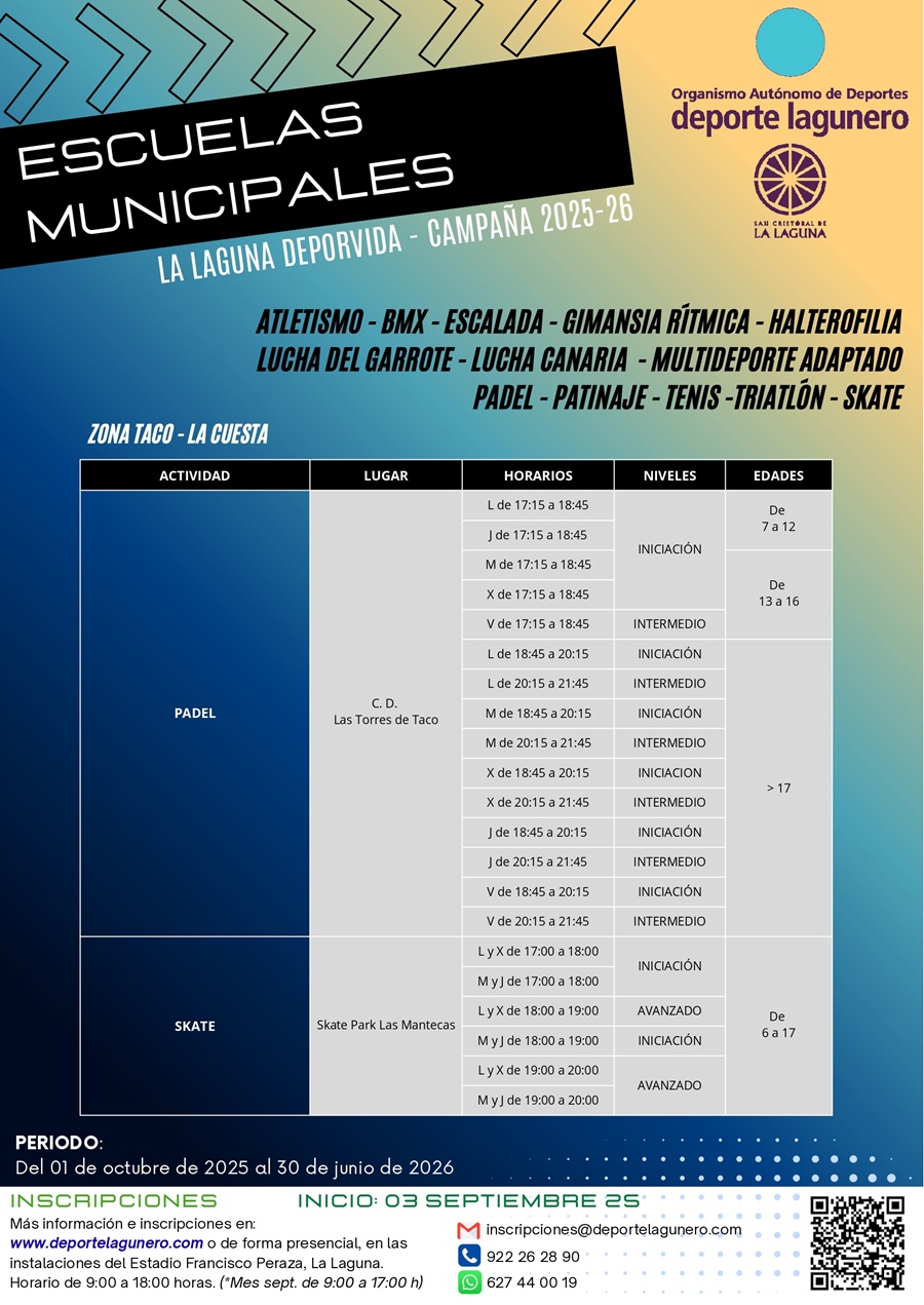 El Ayuntamiento de San Cristóbal de La Laguna, a través del Organismo Autónomo de Deportes, informa que, a partir del miércoles 3 de septiembre, se abrirá el plazo de inscripción para participar en las actividades deportivas de los programas de Escuelas Municipales y Actividades para Adultos, incluidas en el proyecto La Laguna Deporvida. Estas propuestas se desarrollarán en las distintas instalaciones municipales, así como en algunos centros ciudadanos, ofreciendo a la población una amplia oferta deportiva adaptada a diferentes edades y necesidades.