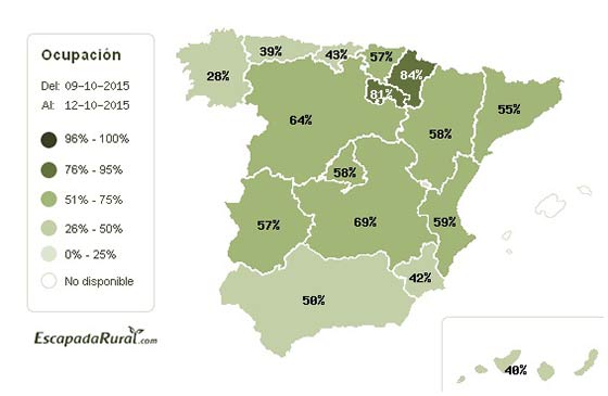 A escasos días del puente del Pilar, el primer día festivo tras las vacaciones estivales, Escapadarural.com, el portal especializado en turismo rural con la mayor oferta nacional de alojamientos (90% del total), ha presentado sus datos de ocupación para las noches comprendidas entre el 9 y 11 de octubre. La media nacional para estas fechas se sitúa en el 57%, lo que representa un incremento de 22 puntos porcentuales respecto a 2014. Esto se debe a que este año el Día de la Hispanidad coincide en lunes, mientras que el año anterior caía en domingo. Por otro lado, el desglose de los datos por noches revela que el próximo sábado 10 es la fecha más demandada, alcanzando un 63% de ocupación.