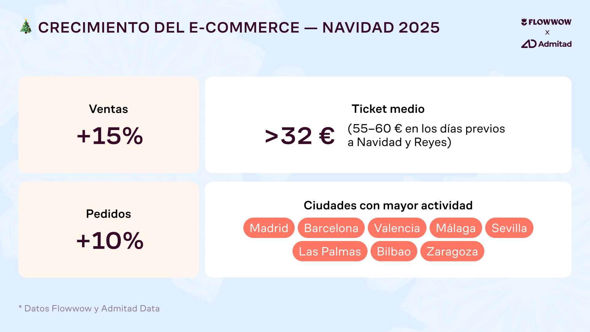 El informe de Flowwow y Admintad, que también ha analizado más de 400.000 pedidos online realizados en diciembre de 2023 y 2024, revela que las compras online registraron un crecimiento interanual entonces del 12% en número de pedidos y un 15% en volumen de ventas. El año pasado, el ticket medio por pedido se incrementó de 20 a 26 euros.