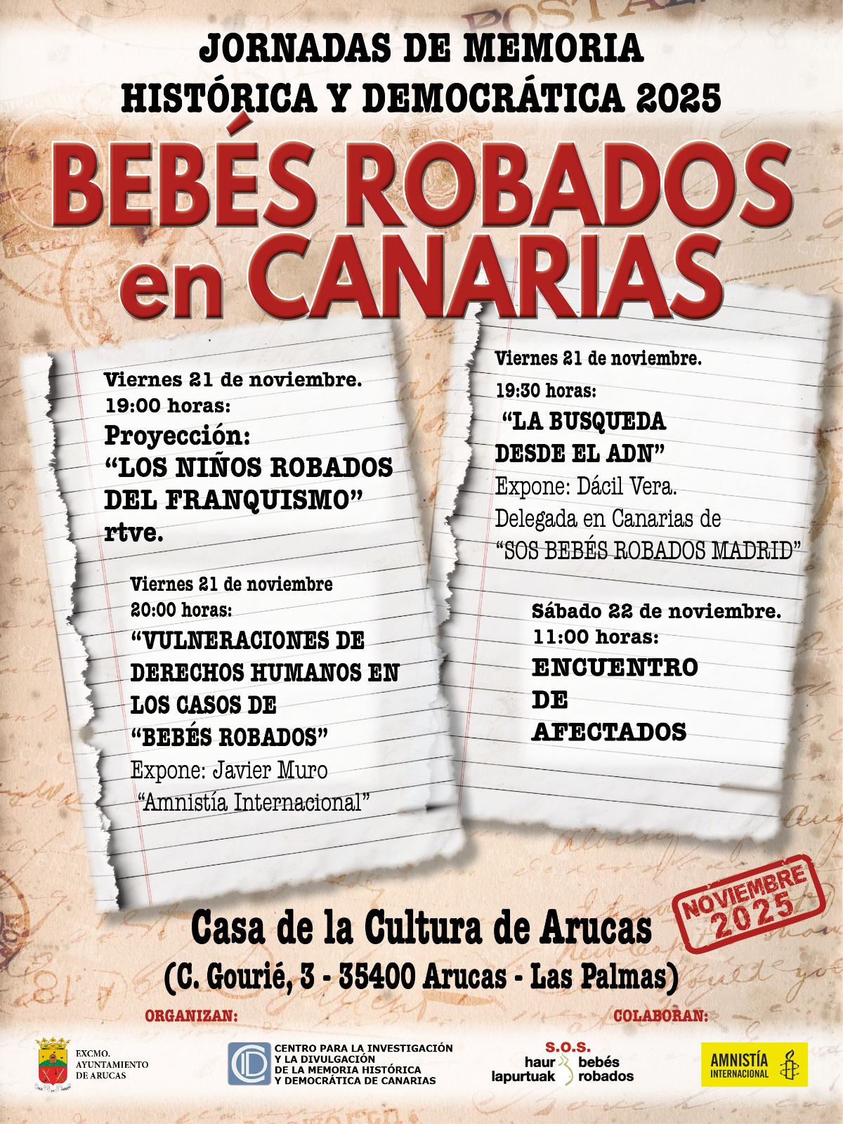 Los días 21 y 22 de noviembre, la ciudad de Arucas será sede de unas importantes Jornadas sobre Bebés Robados en Canarias, un espacio de encuentro, reflexión y divulgación organizado en el marco de las acciones de memoria histórica que impulsa el municipio.