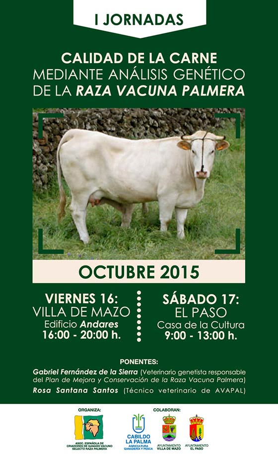 El Cabildo de La Palma, a través del Servicio de Agricultura, Ganadería y Pesca que dirige el consejero José Basilio Pérez, colaborará con las I Jornadas Calidad de la carne mediante análisis genético de la raza vacuna palmera, que se celebrarán el viernes 16 y el sábado 17 en el edificio Andares de Villa de Mazo y en la Casa de la Cultura Braulio Martín de El Paso respectivamente.