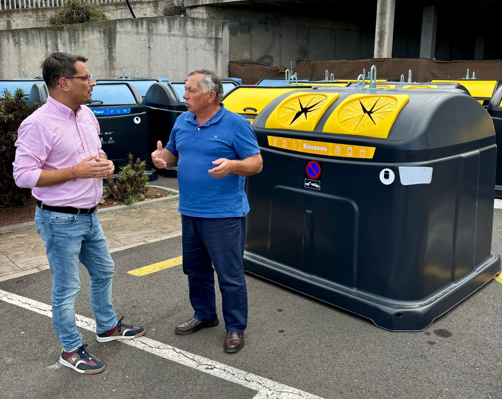 El alcalde y el concejal de Servicios y Aguas junto a contenedores de los servicios de recogida de residuos.//Cedida