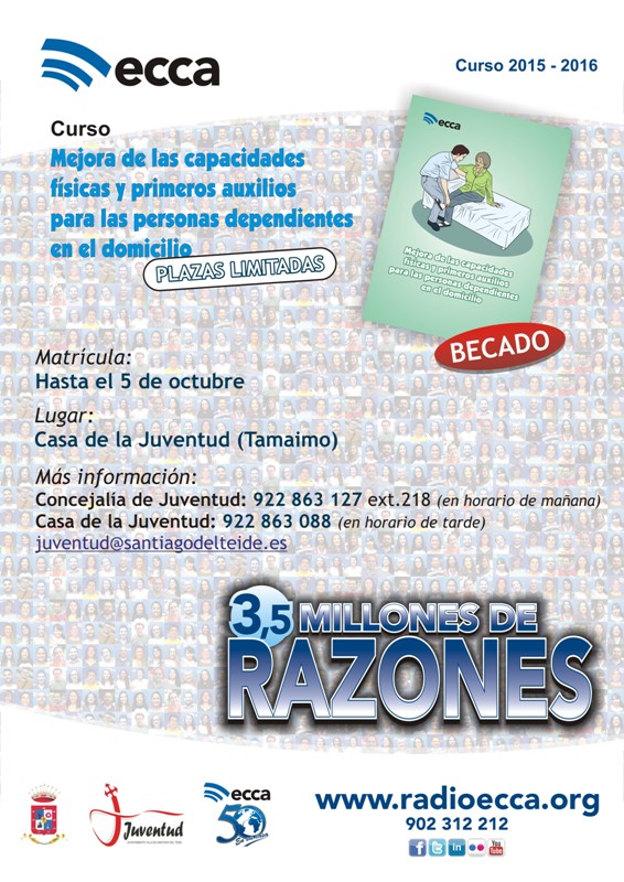La concejalía de Juventud del Ayuntamiento de la Villa Histórica de Santiago del Teide que dirige Alejandra Lecuona va a organizar, conjuntamente, con Radio ECCA un curso becado bajo el título “ Mejora de las capacidades físicas y primeros auxilios para las personas dependientes en el domicilio” que se desarrollará en la Casa de la Juventud de Tamaimo.