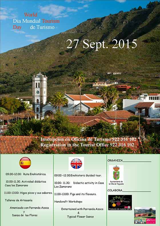 El Ayuntamiento de Tegueste, a través del área de Turismo que dirige el alcalde José Manuel Molina, ha organizado para el próximo domingo día 27 de septiembre una jornada de actividades para conmemorar el Día Mundial del Turismo de 2015 y con el objetivo de dar a conocer su oferta turística; una cita que se llevará a cabo en las instalaciones del Mercadillo del Agricultor y Artesano de la Villa y en la Casa Los Zamorano.