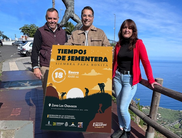 El alcalde de Los Realejos, Adolfo González, y el concejal de Desarrollo Rural, Alexis Hernández, presentaron junto a la representante de la Comisión de Fiestas de Nuestra Señora del Buen Viaje de Icod el Alto 2026, Candy Rodríguez Llanos, el primero de los encuentros etnográficos del municipio de este año, que organiza el Ayuntamiento de Los Realejos con Cabildo de Tenerife y Tenerife Rural. Será este domingo 18 de enero desde las 10:00 horas de la mañana en la zona de Los Chavocos (Icod el Alto) bajo el título ‘Tiempos de Sementera’, con una demostración de la siembra tradicional de la papa bonita en la que colabora la citada comisión festiva.