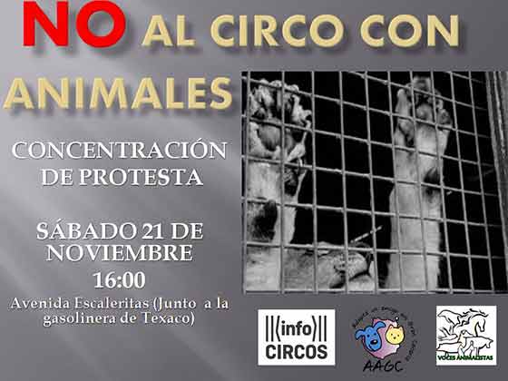 Voces Animalistas en colaboración con Infocircos y la protectora Adopta Un Amigo En Gran Canaria organizan para este sábado 21 de Noviembre a las 16:00 horas en Las Palmas de Gran Canaria una concentración contra el Circo Kaos para mostrar rechazo a los circos con animales. El lugar señalado para ello será en la Avenida Escaleritas (junto a la gasolinera Texaco).