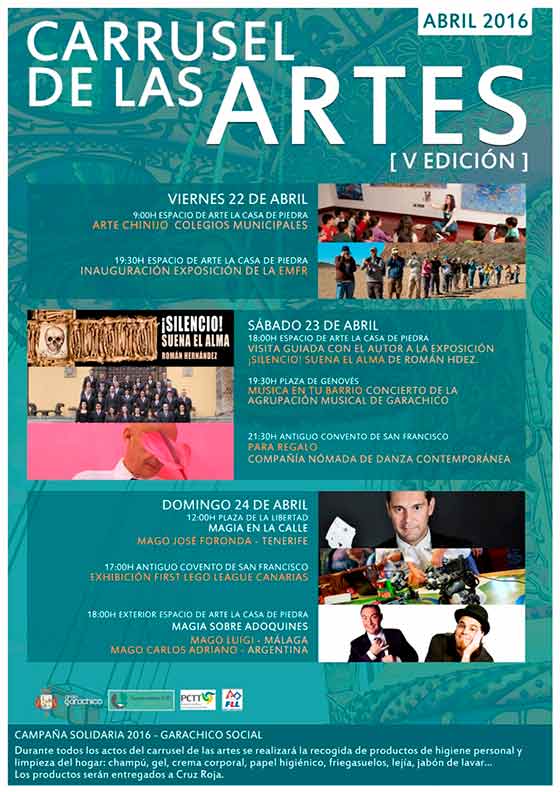 La jornada del domingo 24 será una vuelta mágica para este Carrusel de las Artes. Los magos y sus trucos serán los protagonistas. ‘Magia en la calle’ comenzará a las 12.00 horas en la plaza de la Libertad con el mago José Foronda. Antes de continuar con la magia, el antiguo convento de San Francisco acogerá la exhibición de First Lego League Canarias. Una gran oportunidad para que los más pequeños y pequeñas se interesen por la mecánica, la robótica y la tecnología en general. Esta demostración comenzará a las 17.00 horas.