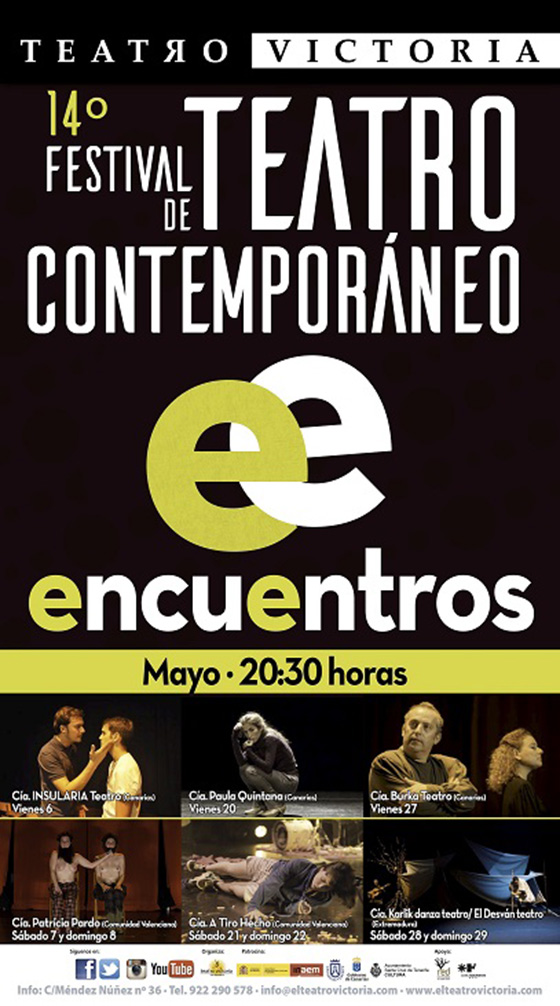 La 14ª edición del Festival de Teatro Contemporáneo Encuentros comenzó el pasado viernes 06 y culmina el domingo 29 de mayo. La estructura del ENCUENTROS se organiza programando compañías teatrales de Canarias los viernes del mes de mayo y compañías foráneas los sábados y los domingos a las 20:30 horas y con entradas a 8€.