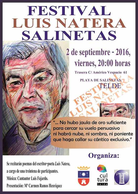 La figura del poeta grancanario Luis Natera será homenajeada este viernes 2 de septiembre a partir de las 20:00 horas, con el Festival Luis Natera Salinetas, un recital que se celebrará en la conocida playa teldense y en la que más de 30 personas participarán dando lectura a algunos de los poemas del escritor que tanta vinculación mantuvo con el municipio durante su vida.
