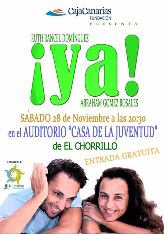 La Concejalía de Cultura del Ayuntamiento de El Rosario presenta, bajo la organización de la Fundación CajaCanarias, a través del proyecto Caja Escénica, la obra teatral “¡Ya!” a cargo de la compañía Teatro 13. Esta nueva propuesta cultural tendrá lugar el sábado 28 de noviembre, a las 20:30 horas, en el Auditorio de la Casa de la Juventud de El Chorrillo. Se trata de una comedia protagonizada por Ruth Rancel y Abraham Gómez, escrita y dirigida por este último. La entrada es gratuita hasta completar aforo.