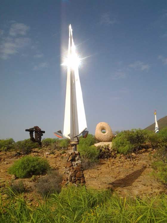 La oferta artística, que está compuesta por más de 100 esculturas en piedra, acero, cristal y madera, podrá visitarse en horario de 14.00 a 17.00 horas. Los grupos interesados deben concertar cita previa en el teléfono 922772331, aceptándose donaciones para los becarios. La nueva obra de espejo pulido se erige como un luminoso ciprés, sobresaliendo con su 4 metros de altura por encima de los cardones y las tabaibas. Para posibilitar el movimiento de la escultura, su creador ha usado un eje de coche garantizando así su resistencia en días de fuerte viento.