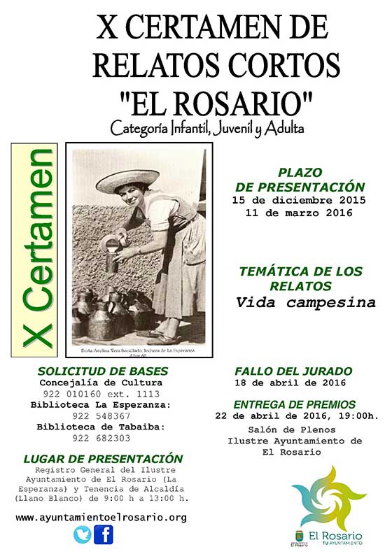 La Concejalía de Cultura del Ayuntamiento de El Rosario, que dirige el edil Fidel Vázquez, convoca, a través de las Bibliotecas Públicas Municipales de La Esperanza y de Tabaiba, el X Certamen Literario en la modalidad de Relato Corto. El plazo de presentación de las obras se inició ayer, martes 15 de diciembre, y finalizará el 11 de marzo de 2016. Como novedades principales del décimo aniversario de este concurso literario destaca que, por primera vez, los relatos deberán estar inspirados en un tema concreto, que en esta edición será el de la “Vida Campesina”, y el aumento de la cuantía para los premios de la categoría Adulta, cuyo ganador se embolsará 500 euros.