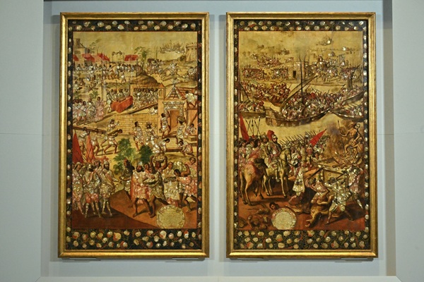 Las nuevas obras invitadas pertenecen a una serie de seis piezas que relatan la campaña militar de Hernán Cortés en México. En la primera de ellas se representa el encuentro de Hernán Cortés con el llamado “Cacique Gordo”, jefe del pueblo totonaca. La segunda tabla muestra una batalla de los soldados del general español frente a dragones y demonios, que representan a los ídolos aztecas Quetzalcóatl y Huitzilopochtli.