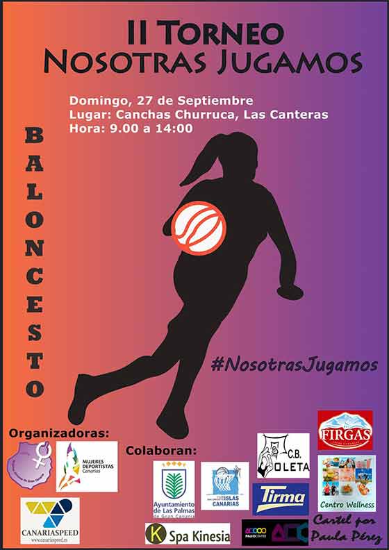 El próximo domingo día 27 de septiembre de 9:00 a 14:00 h. se celebrará el II Torneo “Nosotras Jugamos” de Baloncesto Femenino en las canchas deportivas de la Plaza Churruca, en Las Canteras. El Torneo está organizado por las Asociaciones “Mujeres Deportistas Canarias”, “Mujeres Jóvenes de Gran Canaria Ágora Violeta” y “Asociación C.D. Speed Bádminton Canarias”, contando con la colaboración del Ayuntamiento de Las Palmas de Gran Canaria y el Instituto Municipal de Deportes.