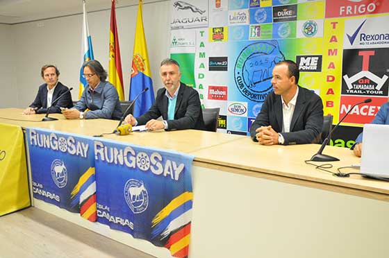 El consejero de Deportes del Cabildo de Gran Canaria, Ángel Víctor Torres, acompañado por el alcalde de Artenara, Roberto García, el alcalde de Agaete, Juan Ramón Martín y el representante del Club deportivo Montaña Rungosay, organizador de la Tamadaba Trail, Enrique Díaz-Bethencourt, presentaron una nueva edición de esta carrera de montaña, que se desarrolla el 5 de diciembre.
