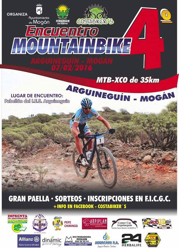 Este domingo 7 de febrero Mogán acogerá el IV Encuentro de Mountain Bike. Este edición está organizada con la colaboración de Costabiker`s, Club Deportivo Femarguín y el Ayuntamiento de Mogán. Más de 200 inscritos participarán en la prueba que saldrá desde el I.E.S. Arguineguín.