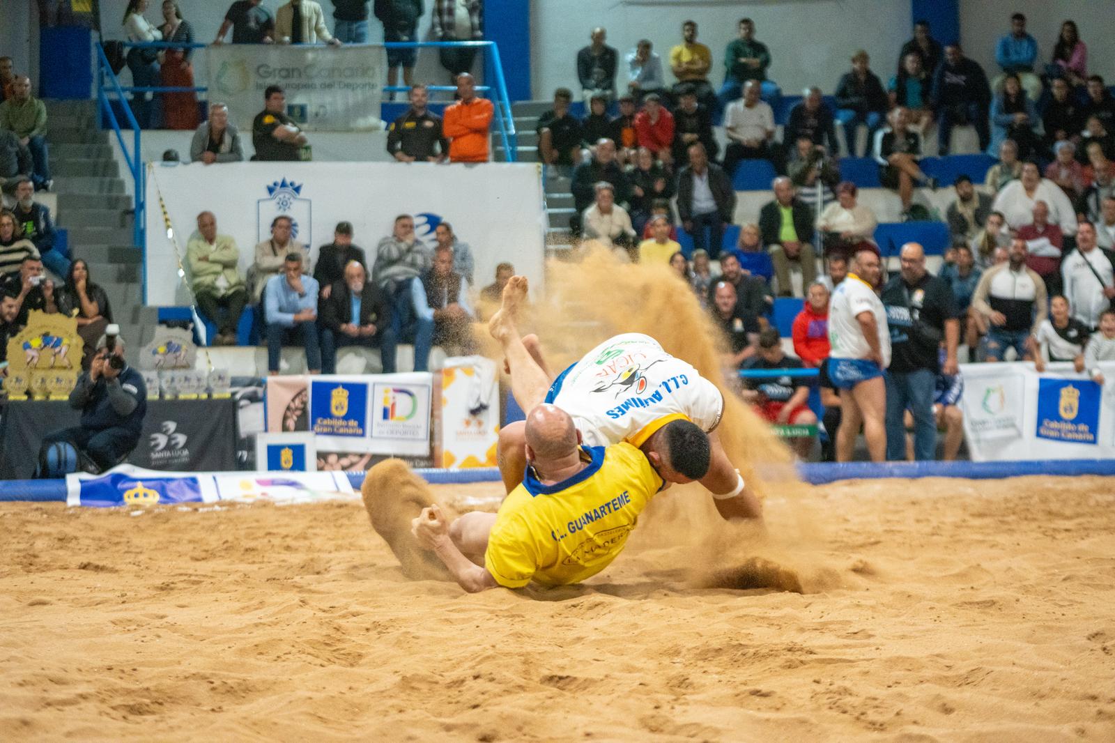 Turno para Jonathan González en el Unión Agüimes y, como no, Abián Sánchez para el Guanarteme. La primera de las agarradas cayó del lado amarillo, aunque le costó caro a Abián porque tuvieron que intervenir rápido las asistencias por un pinchazo en el muslo de su pierna derecha que imposibilitaron su continuidad en la luchada. Por lo tanto, sin tener más luchadores el Guanarteme, el Unión Agüimes se proclamó campeón con el 12-10 final.