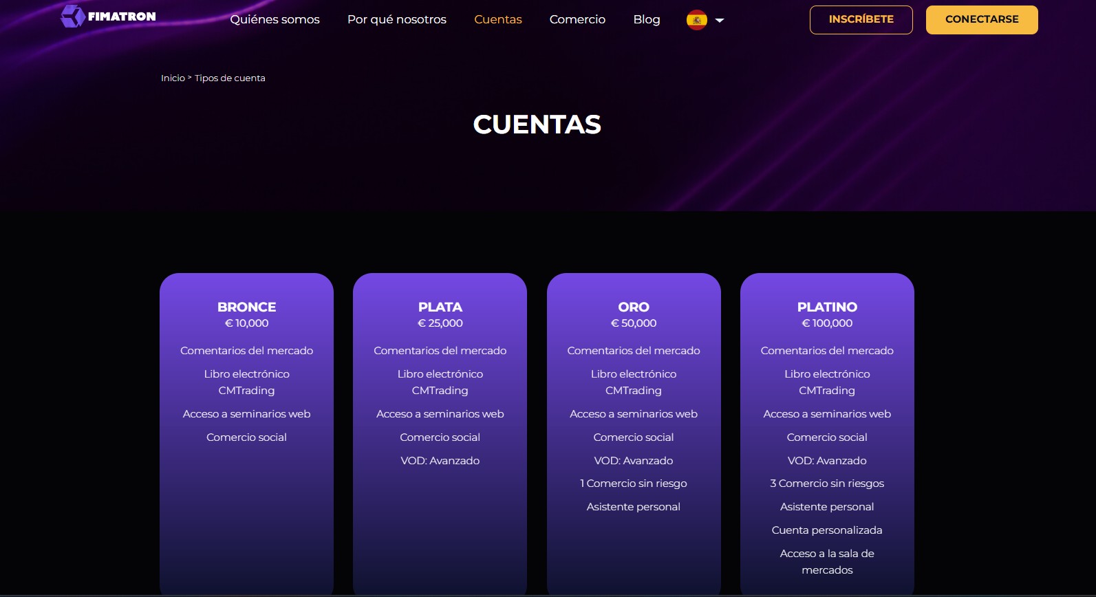 Reseña de Fimatron.com completa de niveles de cuenta, mínimos de inversión y características premium. Análisis detallado para traders e inversores serios