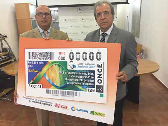 Por otro lado, la ONCE ha presentado en las instalaciones de Eurocanarias Oftalmológica su nuevo cupón dedicado a la Fundación Jiménez Díaz, que saldrá a la calle el próximo jueves, 8 de octubre, para celebrar los 15 años que lleva colaborando en asesoramiento genético para prevenir la ceguera.