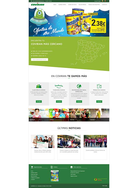 Espacios como el Club Familia, su Fundación, su plan de actuación en materia de RSE, información sobre sus productos y, por supuesto, todas las promociones vigentes en cada momento, son contenidos que acercan la compañía a sus diferentes grupos de interés. Esta nueva página está pensada para conectar con colectivos tan diferentes como clientes, socios actuales y potenciales, periodistas o instituciones. En definitiva, una web adaptada al momento actual de Covirán.