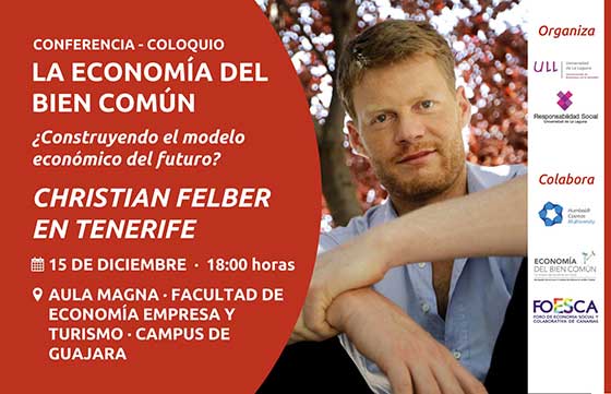 Christian Felber, promotor de la Economía del Bien Común, un concepto extendido ya en 40 países, impartirá una conferencia el próximo martes 15 de diciembre en la Universidad de La Laguna, en el Aula Magna de la Facultad de Economía, Empresa y Turismo a las 18 horas, tras la que tendrá lugar un coloquio moderado por la periodista María Fresno en el que intervendrán, profesionales de la comunicación, profesores universitarios y el público asistente. En la web www.ull.es/rsocial está disponible el enlace al formulario de inscripción.