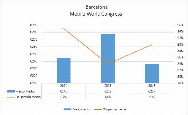 Si lo comparamos con el año pasado, el precio medio durante el evento ha disminuido un 14%, pasando de los 278€ a los 237€. La ocupación hotelera también demuestra un mayor éxito para esta edición pues, si en 2015 el 16% de los hoteles mostraba habitaciones disponibles, este año apenas el 10% ofrece disponibilidad a través de Internet. Aunque en 2014 se registró una mayor ocupación hotelera, con tan solo un 5% de disponibilidad, este año se registra el precio más económico de las últimas ediciones.