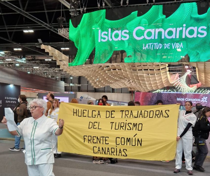 El Frente Común de Canarias se manifiesta en FITUR, Madrid 2025, para denunciar la insostenibilidad del modelo turístico y alentar a las trabajadoras para ir a la huelga en el sector