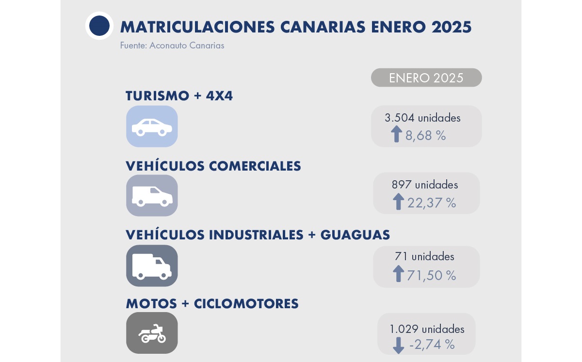 El mercado total de turismos y todoterrenos crece el pasado mes de enero un 8,68% con respecto a enero de 2024, con 3.504 unidades matriculadas. Un ligero crecimiento que se sostiene gracias a las matriculaciones registradas por parte de las empresas de Rent a car. Un mes más, es el sector turístico el que salva al mercado de automóviles de las Islas, pero las familias canarias siguen sin capacidad económica para poder comprar un coche nuevo. Así se desprende del análisis de las matriculaciones por canales.