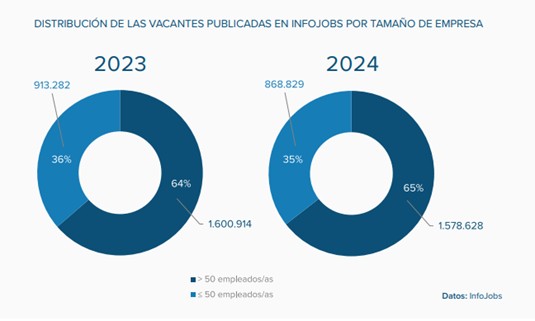 En este sentido, los datos del Informe InfoJobs-Esade sobre el Estado del mercado laboral en España 2024 permiten observar cómo se distribuyen las oportunidades laborales según el tamaño de la empresa: el 65% de las vacantes publicadas en la plataforma proceden de compañías de más de 50 empleados, mientras que el 35% restante tiene como origen empresas de hasta 50 trabajadores. Esta distribución es prácticamente idéntica a la registrada en 2023 (64% y 36%, respectivamente), pero eso no significa que no haya habido algunos cambios que merezcan atención. En concreto, en el caso de las compañías con más de 50 empleados, el descenso en el número de vacantes ha sido mínimo –apenas un 1%, lo que supone 22.286 vacantes menos en términos absolutos–. En cambio, las empresas más pequeñas han acusado un mayor retroceso: un 5% menos de vacantes respecto al año anterior.
