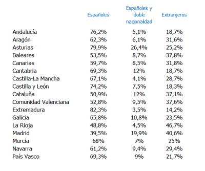 Las comunidades con un mayor peso de empleados solo españoles son Extremadura (82,3%), Asturias (79,9%) y Andalucía (76,2%). Las comunidades autónomas con un mayor peso de los empleados con doble nacionalidad y extranjeros son Madrid (60,5%), La Rioja (51,2%), Cataluña (49,1%), Comunidad Valenciana (47,1%) y Baleares (46,5%).