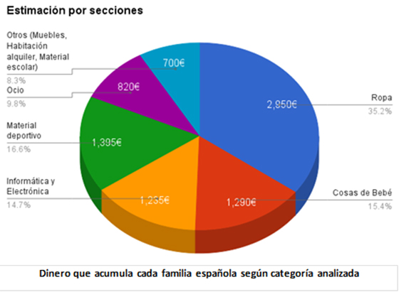 Tal y como indican desde Tablón de Anuncios la cantidad que podríamos obtener depende mucho del tipo de familia, pero si consideramos que el hogar medio en España está formado por una familia de 3 miembros (pareja y un hijo) esta cantidad rondaría fácilmente los 7.000€, siendo ropa y complementos la categoría donde mayor cantidad de dinero podríamos conseguir, seguida de todo aquello relacionado con bebés (cochecitos, cunas, tronas…), informática, (ordenadores, tablets, móviles…), material deportivo, ocio-aficiones y otros, como puede verse en el gráfico.