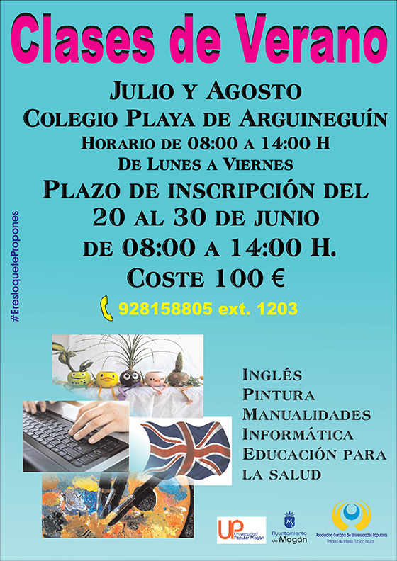 Los talleres, clases y actividades de verano se realizarán en los meses de julio y agosto en el centro educativo Playa de Arguineguín. El plazo de inscripción se abrirá el 20 de junio y se mantendrá abierto hasta el día 30. Los niños y niñas de entre 3 a 12 años inscritos realizarán, entre otras actividades, clases de inglés, informática, educación para la salud, manualidades y pintura.