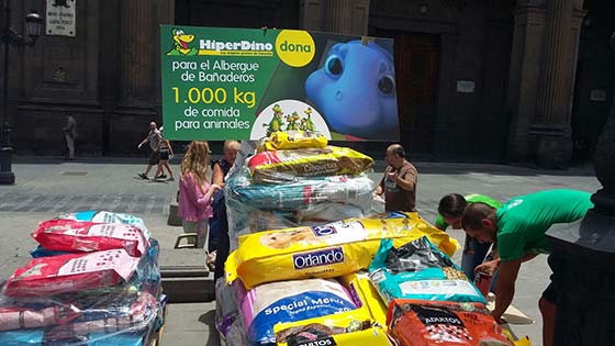 El grupo DinoSol ha donado en un evento organizado por Tropical 1.000 kilos de comida para el albergue de Bañaderos, entre comida de perros y gatos, así como arena para los gatos y camitas para que puedan descansar más cómodos. El acto se realizó este miércoles 22 de junio en la plaza Santa Ana de 12.00 a 19.00 horas y contó con la presencia de Olivia Llorca, directora de Marketing del Grupo DinoSol y Luis Durango, director de Comunicación de Tropical.