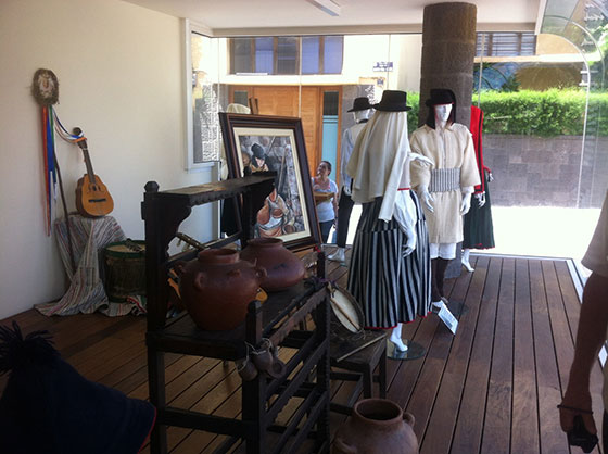 El vestido de una maestra también integra la muestra junto a los trajes de domingo y festivos de los campesinos del siglo XVIII, cuando abundaban las faldas o enaguas listadas de telar blancas y azules por el cultivo del añil, así como las amarillas, encarnadas y azul, entre otras combinaciones.