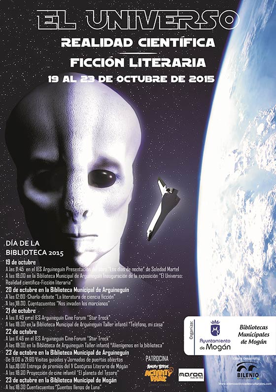 El martes 20 de octubre se encuentra programada a las 12:00 horas en la biblioteca municipal de Arguineguín una charla-debate, en la que participarán el alumnado del Centro de Adultos de Mogán y que tiene como título ‘La literatura de ciencia ficción’. El mismo día y en el mismo lugar, a las 18:30 horas, se realizará la actividad de cuentacuentos infantil ‘Nos invaden los marcianos’.