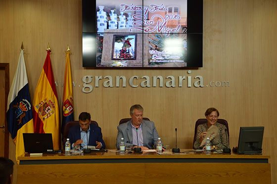 El consejero de Cultura del Cabildo de Gran Canaria, Carlos Ruiz, el alcalde de Valsequillo, Francisco Atta, y la concejala de Cultura, Elvira Vaquero han presentado en una rueda de prensa el programa de actos de Las Fiestas y Feria de San Miguel 2015. Unos festejos que suscitan cada año la participación masiva de los vecinos y vecinas de Valsequillo, así como, del resto de gran canarios y turistas. Su apoyo y respaldo hacen de las fiestas patronales del municipio un evento de integración y convivencia vecinal, de cuyo esfuerzo e ilusión son resultado actos como la Romería-Ofrenda a San Miguel, el Festival Internacional de Payasos “Tres Días de Farándula”, la “Gran fiesta guateque de los años 60”, “El Pub Miguelito” o la “Suelta del Perro Maldito”.