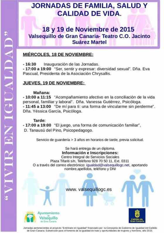 Ya están abiertas las inscripciones para las Jornadas de Familia, Salud y Calidad de Vida titulada “Vivir en Igualdad” que se impartirán los próximos días 18 y 19 de noviembre en el municipio de Valsequillo. Unas jornadas organizadas por el Ayuntamiento de Valsequillo que forman parte del proyecto “Entrenate en Igualdad” financiado por la Consejería de Gobierno de Igualdad del Cabildo de Gran Canaria.
