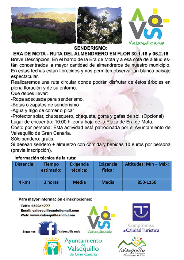 La concejalía de Turismo del Ayuntamiento de Valsequillo en colaboración con la Asociación de Senderos Valsequillo Niguada han organizado dos senderos gratuitos para disfrutar de la belleza de los Almendreros en Flor. Esta actividad será el próximo 30 de enero y 6 de febrero y transcurrirá por el barrio de la Era de Mota.