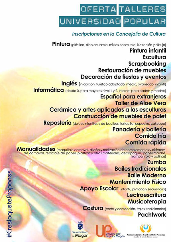 Hasta nueve cursos y talleres de la Universidad Popular de Mogán han dado hoy comienzo. El Ayuntamiento de Mogán busca con esta iniciativa el acceso a la formación continua de todos los ciudadanos. Así, los objetivos de la Universidad Popular de Mogán son la ampliación de conocimientos, el desarrollo del cremiento personal, la promoción de la participación social para la mejora de la calidad de vida de la población moganera y la conservación de sus tradiciones.