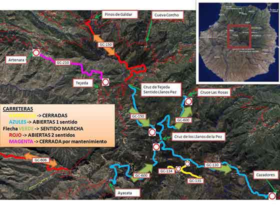 En cuanto a la 210 de Tejeda a Artenara, la previsión es que pueda ser abierta a las 17.00 horas y hasta entonces, con precaución, podrán pasar los servicios de emergencias y el servicio de Global.