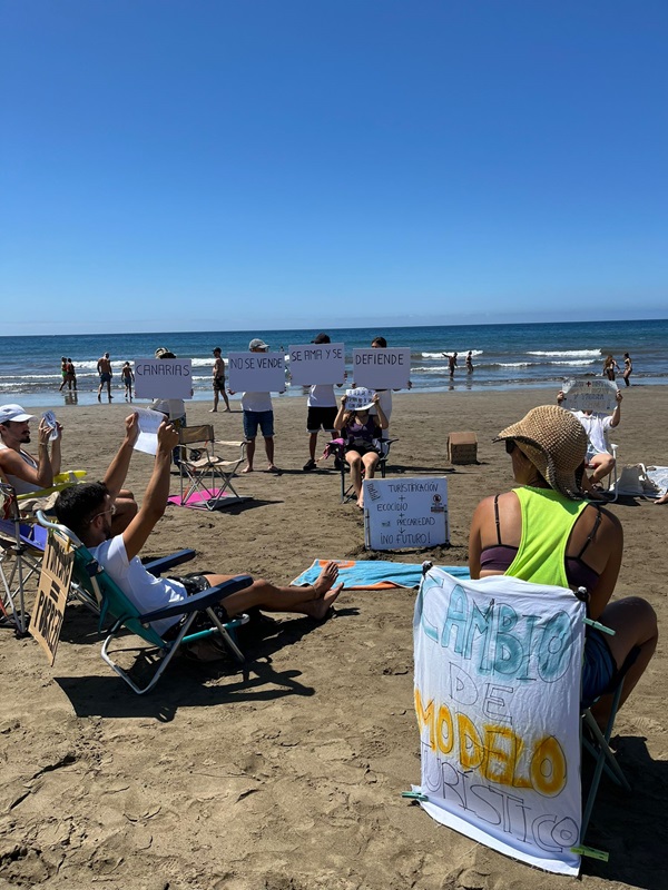 Este domingo 28 de julio, la Coordinadora 20A Gran Canaria llevó a cabo una protesta en Maspalomas para seguir denunciando la inacción de los dirigentes políticos, tres meses después de las masivas manifestaciones que se realizaron en todas las islas. Los diferentes colectivos han desplegados sus sillas de playa con carteles reivindicativos como “Piscina + Hotel = ¡Menos Tierra y Agua Pa Comer!”, “Esta playa no es de los hoteleros, es mía que la herede de mis abuelos.”, manteniéndose en silencio y ocupando el espacio como acto de protesta. En este contexto, la Coordinadora 20A señala al Cabildo de Gran Canaria como el principal responsable del deterioro medioambiental y social de la isla. Aunque el Cabildo dice promover un modelo de isla “ecosostenible”, su plan de expansión turística está llevando a Gran Canaria al borde del colapso.