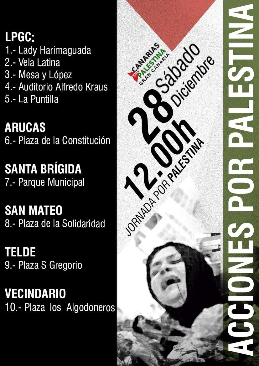 La Plataforma unitaria CANARIAS POR PALESTINA convoca a una jornada de Acciones de Solidaridad con Palestina el próximo sábado 28 de diciembre a las 12:00 horas.