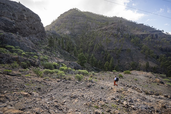 Los pinares sureños gobiernan el panorama con la majestad de su silencio. Aunque el territorio sigue hablando con su lenguaje centenario. A Rafa le vienen al recuerdo las historias que ha escuchado de su familia y de gente mayor, relatos de bebés que eran portados a pie desde el valle de Mogán hasta San Mateo, en busca del único médico que podía sanarle. Por esos caminos se movían la supervivencia, la desesperación, la felicidad y hasta los amoríos, porque eran las únicas vías de comunicación para ir a las fiestas, para el encuentro o para adentrarse en los lugares donde estaba la madera o cualquier forma de ganarse el sustento.