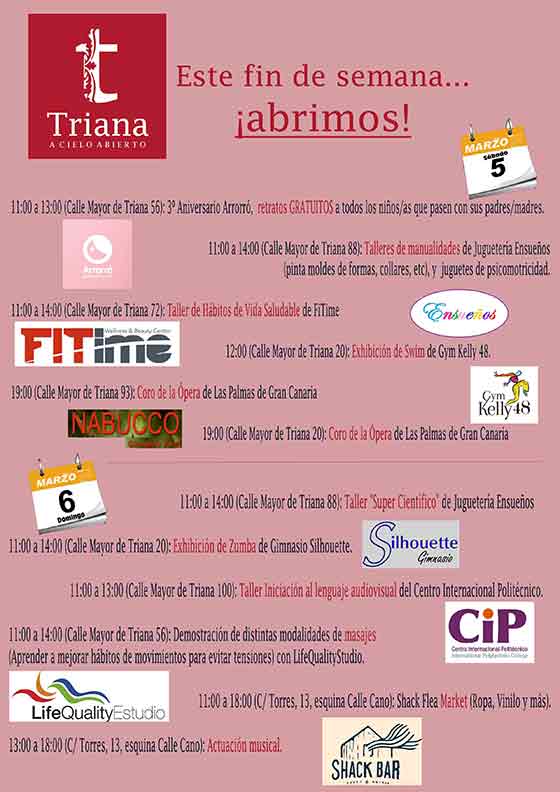 La Asociación de empresarios de Zona Triana ha ampliado su habitual “primer domingo abierto” a todo el fin de semana donde la mayor parte de los comercios estarán abiertos. Además de contar con una amplia gama de bares, restaurantes y cafeterías para dar servicio a los visitantes.